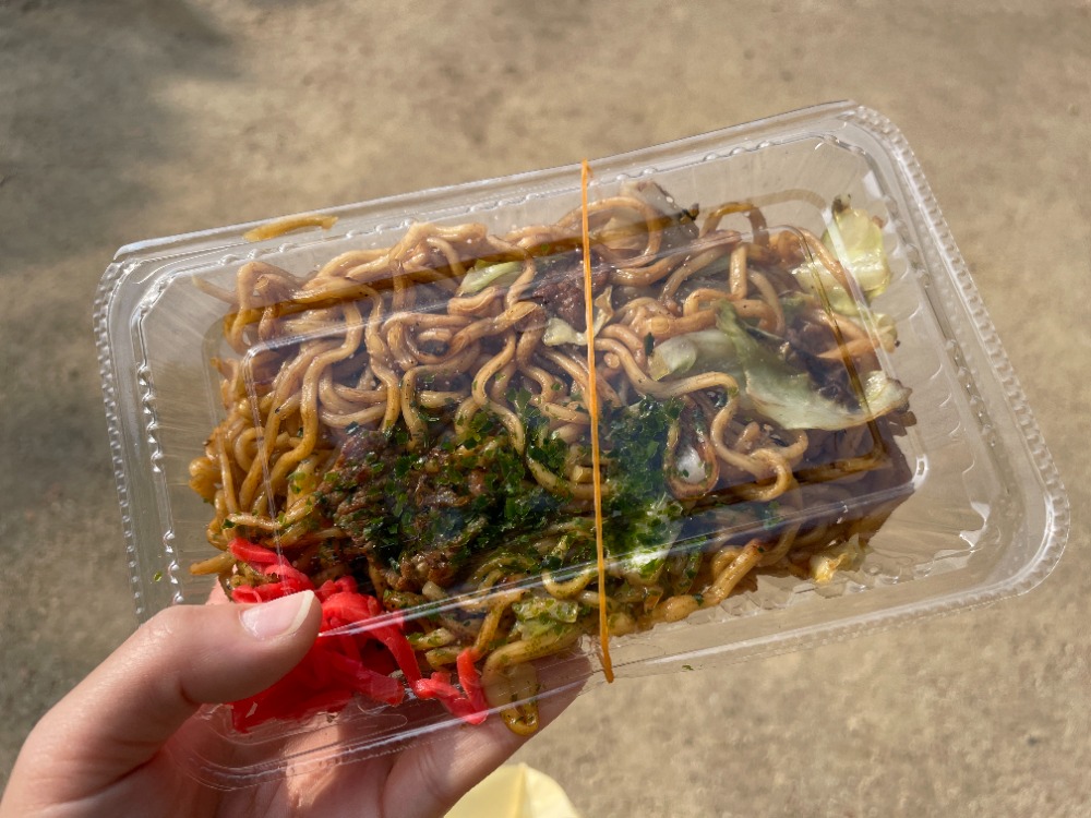 私は焼きそばを購入しました。屋台の焼きそばっておいしいですよね~。広場の奥にあるあずまやで休憩しながらいただきました。外で食べるとより一層おいしく感じられますね。
