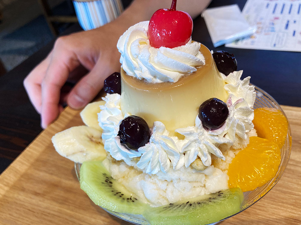 スイーツ大好き5歳の次男は、散々迷って「真夏のプリンアラモード」にしました。キャラメルソース入りの米麹かき氷の上にプリンアラモードがのっている、とてもゴージャスなかき氷です。
