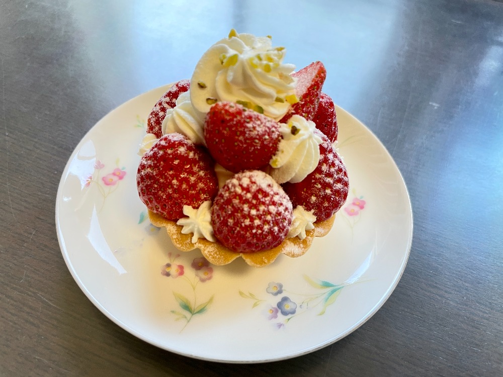 こちらは今が旬のいちごのタルトです。ダマンド(アーモンドクリーム)入りのタルトに生クリームとカスタードクリーム、いちごがたっぷりとのっています。いちご好きにはたまらない!
