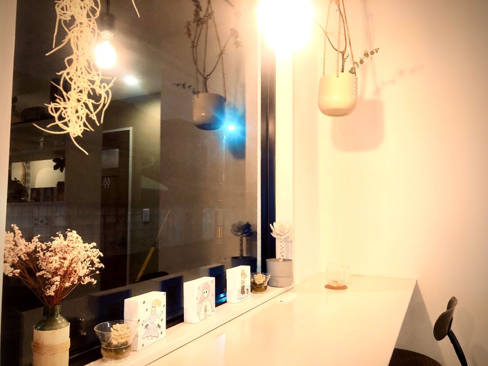 晴れた日の日中なら太陽の光が差し込むであろうカウンター席には、美しいお花が飾られていました。