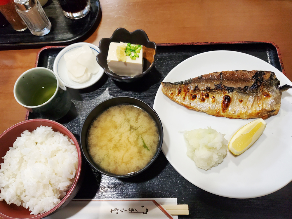 私はカツ丼も気になりつつ、夫のおすすめの「サバ塩焼き定食」を注文しました。