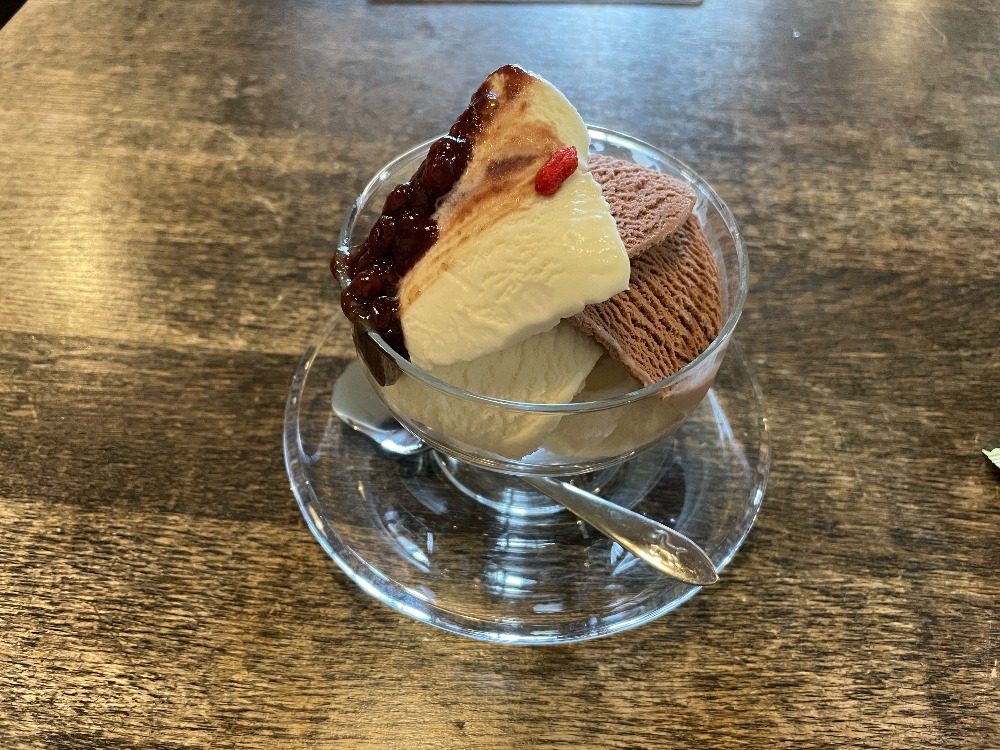 出てきたのはミニパフェのようなかわいいアイスです。バニラアイスとチョコアイスがたっぷり!あんこものっていて、いろんな味が楽しめる、けれど素朴な、昔ながらのおいしいアイスクリームでした。