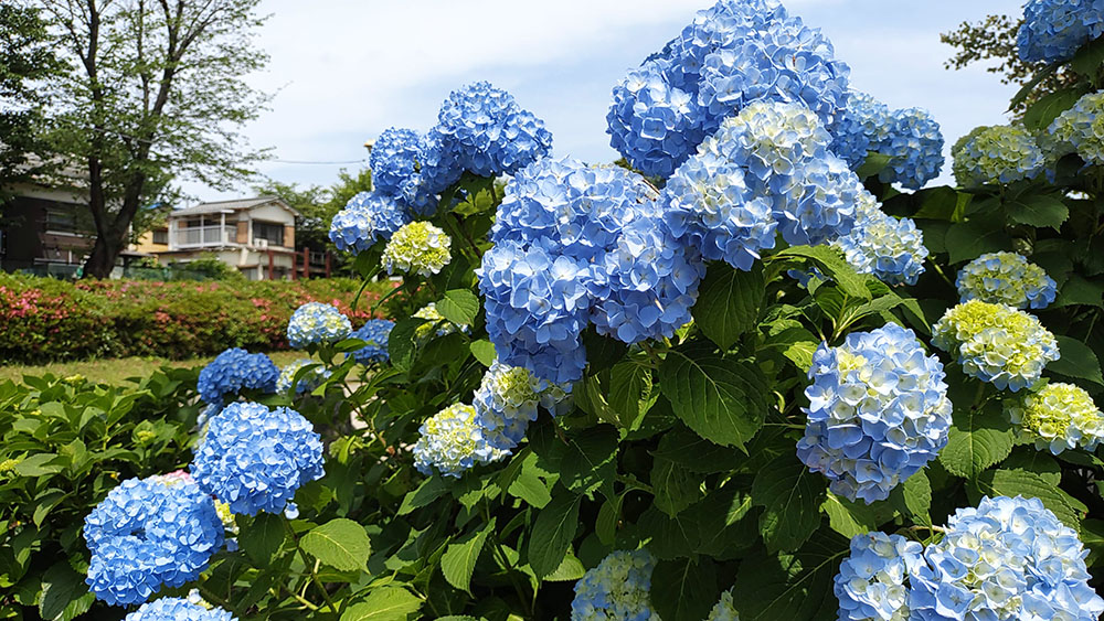 青いアジサイがたくさん咲いていてとてもきれいです。