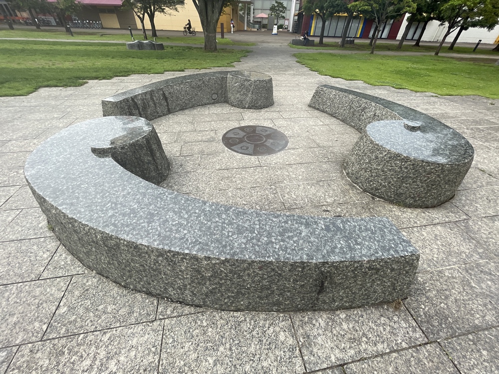 公園内には、ところどころに石のベンチがありました。よく見ると、それぞれ異なったユニークな形をしています。ベンチにしては座りずらそうな形もあったり…。