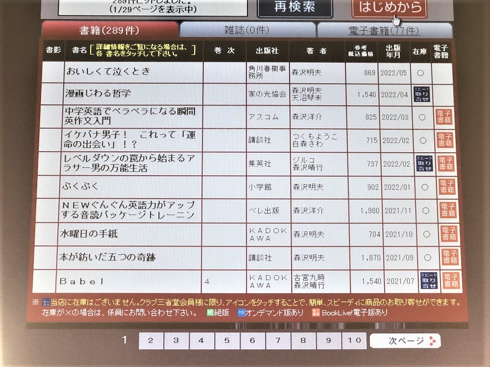 在庫がない場合、『クラブ三省堂』に入会している方は、この検索機で取り寄せ手続きができます。入会していない方でも該当する本を表示すると、その画面をプリントすることができるので、レジでプリントアウトしたものを見せて、取り寄せをお願いしましょう。