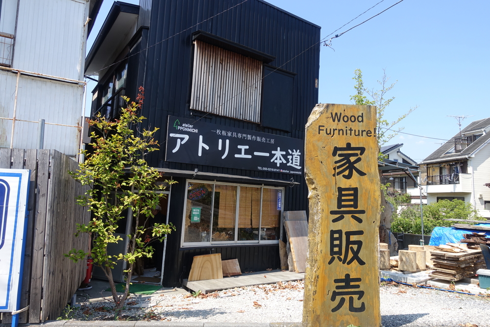 大きな1枚板に「家具販売」、奥に「アトリエ一本道」と書かれた黒い看板が目印のお店です。