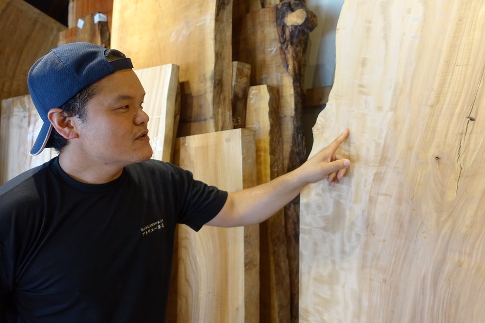 こういった木に触れる機会があったのちに、たまたま自宅のテーブルを一枚板のダイニングテーブルに買い替えるタイミングがあったそうです。こんなに素晴らしい家具があるのだと、その時の感動が忘れられず、2019年に「アトリエ一本道」を創業したとのことでした。